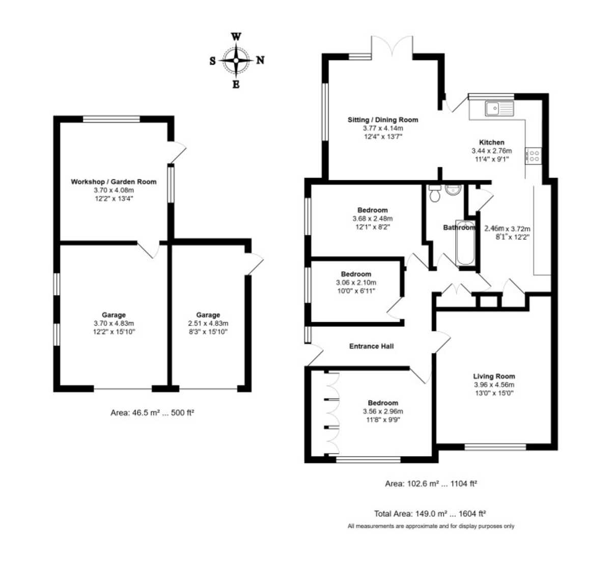 OUTSIDE Approaching 280ft overall at its longest point and well set back from the road by a maturely lawned frontage with long driveway providing ample off-road parking and access to double garages, there is a sheltered separation between the bungalow and garages which finds a door into the smaller garage and the entrance door into the bungalow. Gated pedestrian access reveals the fabulous, established leafy westerly facing generous garden mainly laid to mature lawn stocked to boundaries with an array of trees and shrubs. A paved courtyard area stores a 1000 litre plastic oil tank and offers double glazed door access into the workshop/garden room, furthermore there is a charming wooden summerhouse and two external taps. Finally, there is a paved low wall enclosed entertainment patio. The garden is enclosed by fencing, and enjoys an attractive, panoramic open outlook.